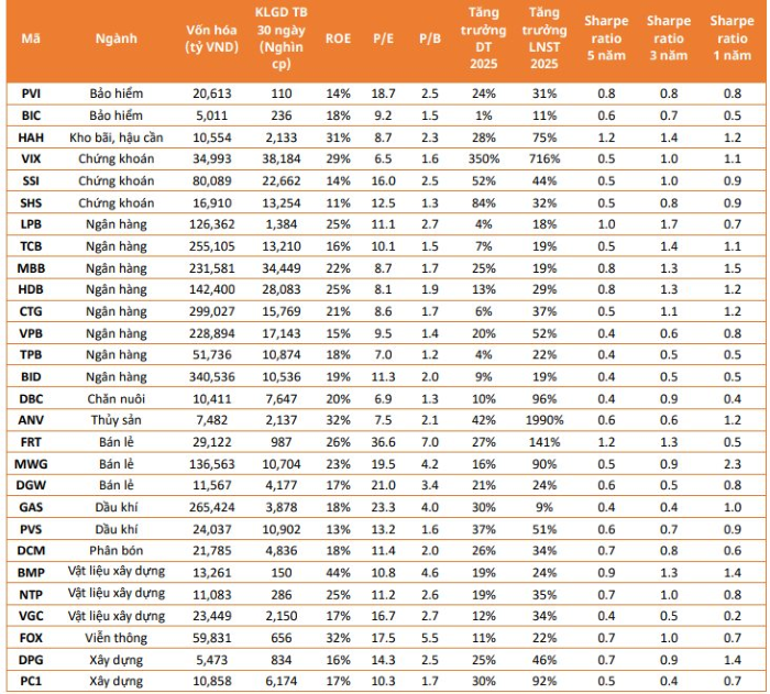 Trong báo cáo mới nhất, Chứng khoán Mirae Asset (MASVN) đưa ra danh mục đầu tư xây dựng dựa trên bộ lọc Sharpe Ratio, kết hợp KQKD 2025, tập trung vào các doanh nghiệp có nền tảng tài chính vững chắc và triển vọng tăng trưởng bền vững. Các cổ phiếu được lựa chọn dựa trên các tiêu chí như: vốn hóa trên 5.000 tỷ, khối lượng giao dịch trung bình cao hơn 100.000 cổ phiếu, Sharpe Ratio dương và ổn định, ROE>10%,…